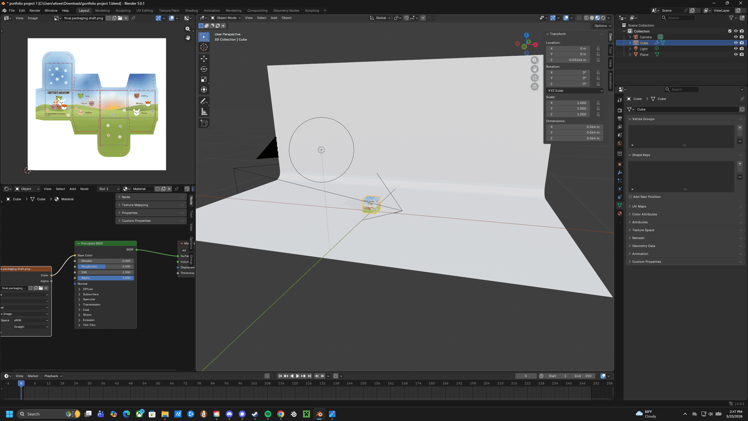After making iterations on the design using participant feedback, I started creating a mockup within Blender. This specific part of the process was an entirely new skill for me to learn, as I had very minimal experience with Blender. I created a very basic photoshoot setup with a cube acting as a sample of the package.