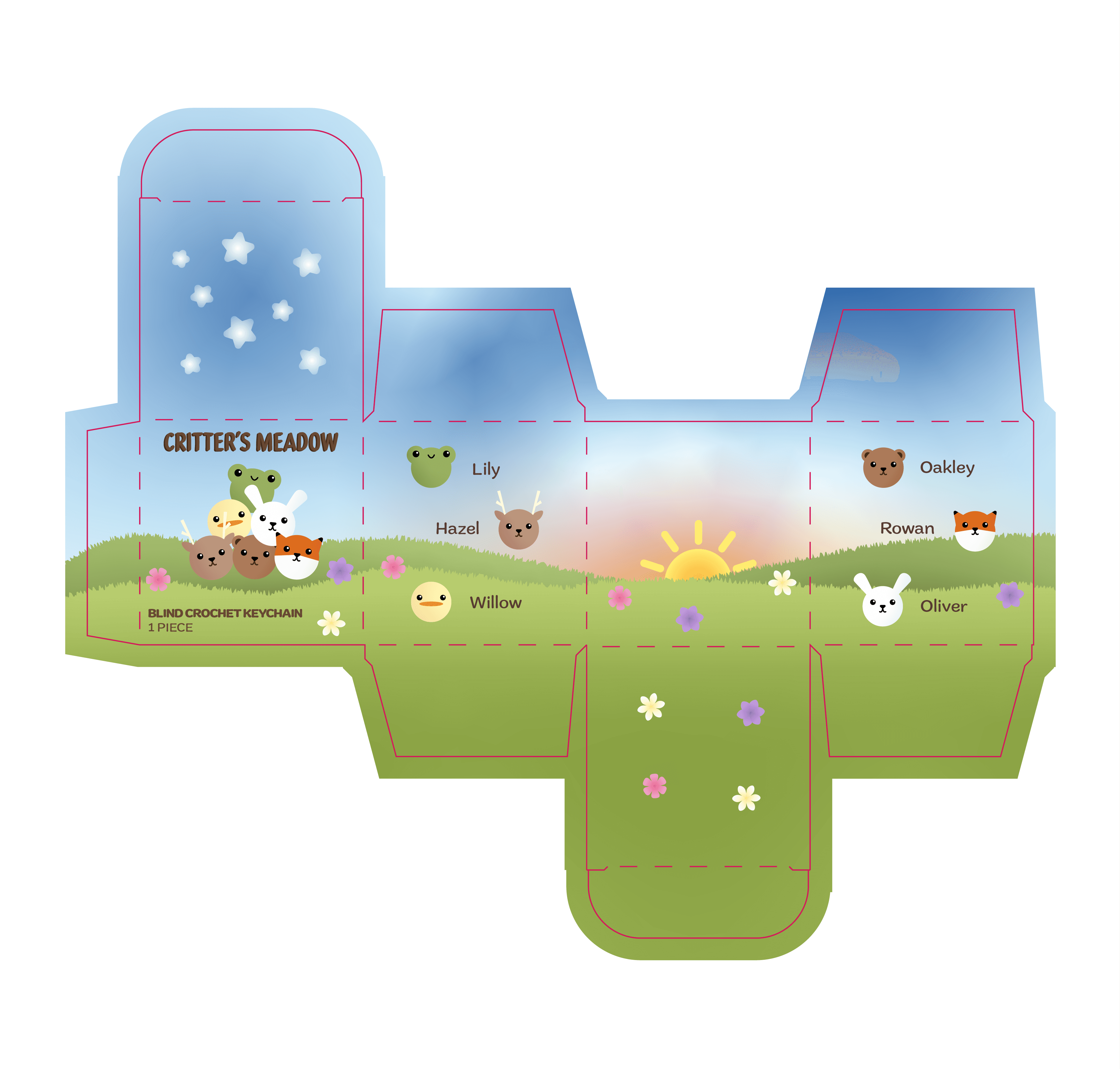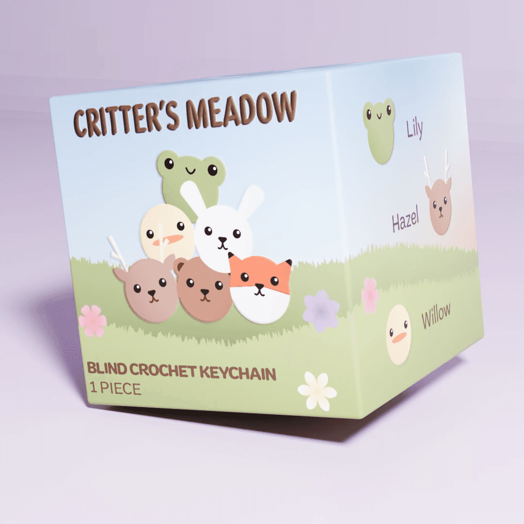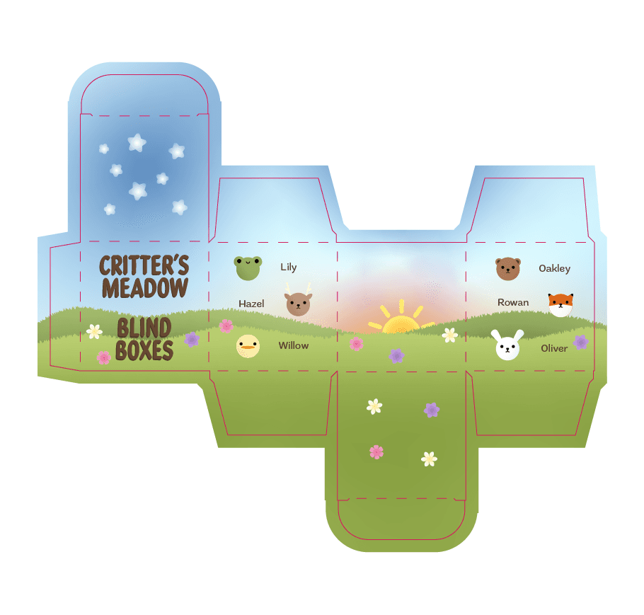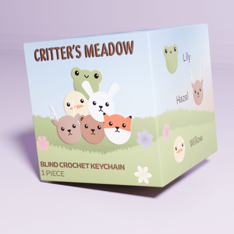 A blind box package design that focuses on making all of the animal keychains into their own identifiable critters. Clearly labeled to ensure there was no confusion about what was being sold. Following the general meadow, pastels, and cute aesthetic of the original keychains.