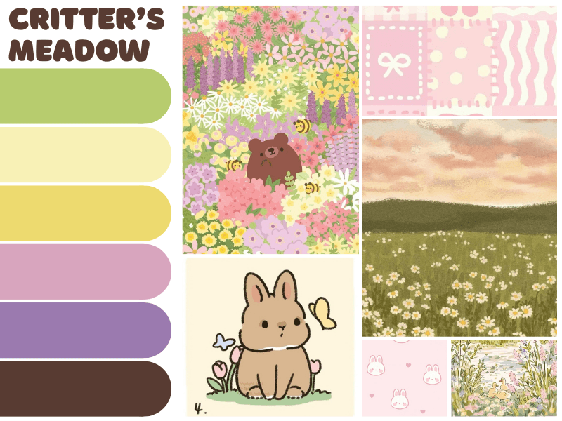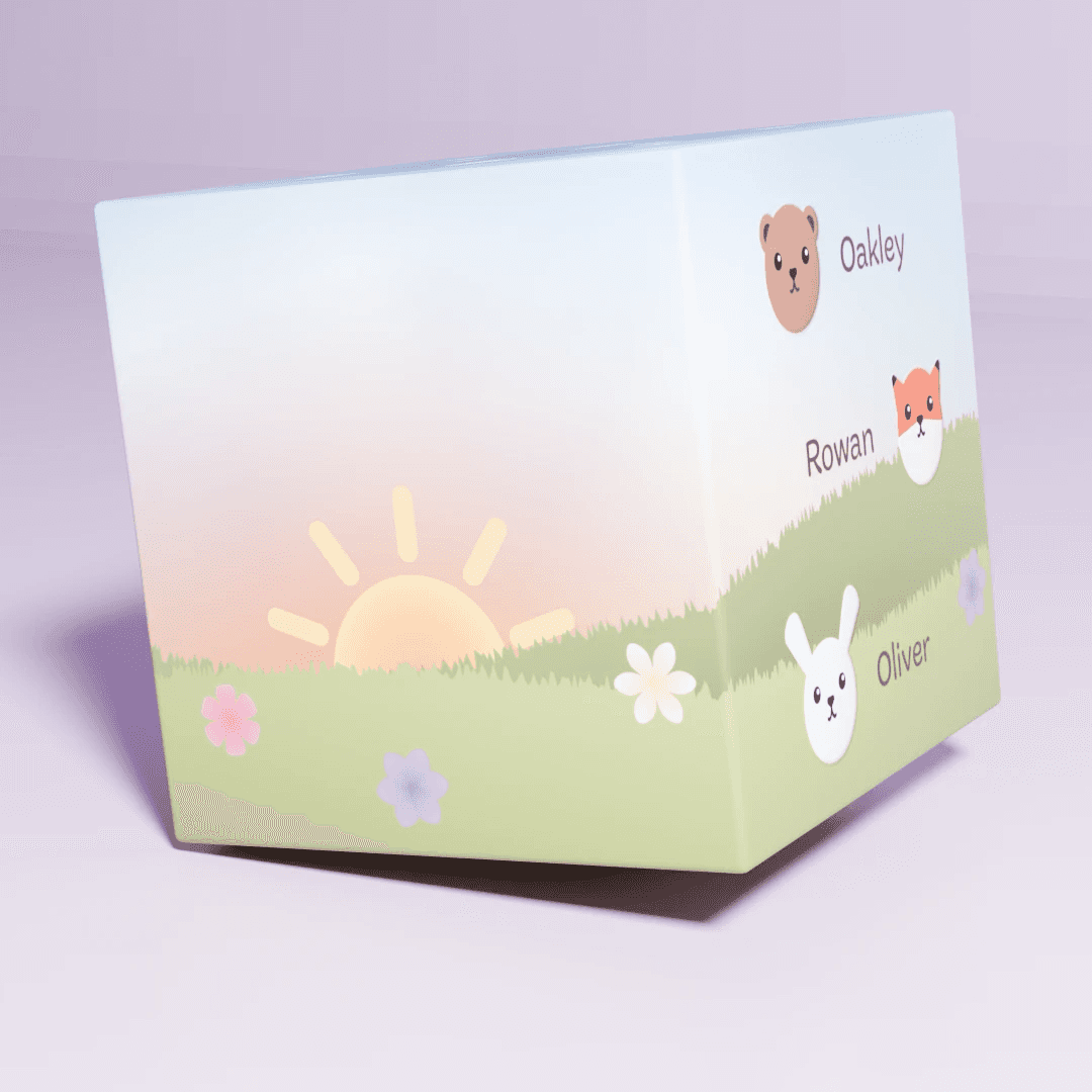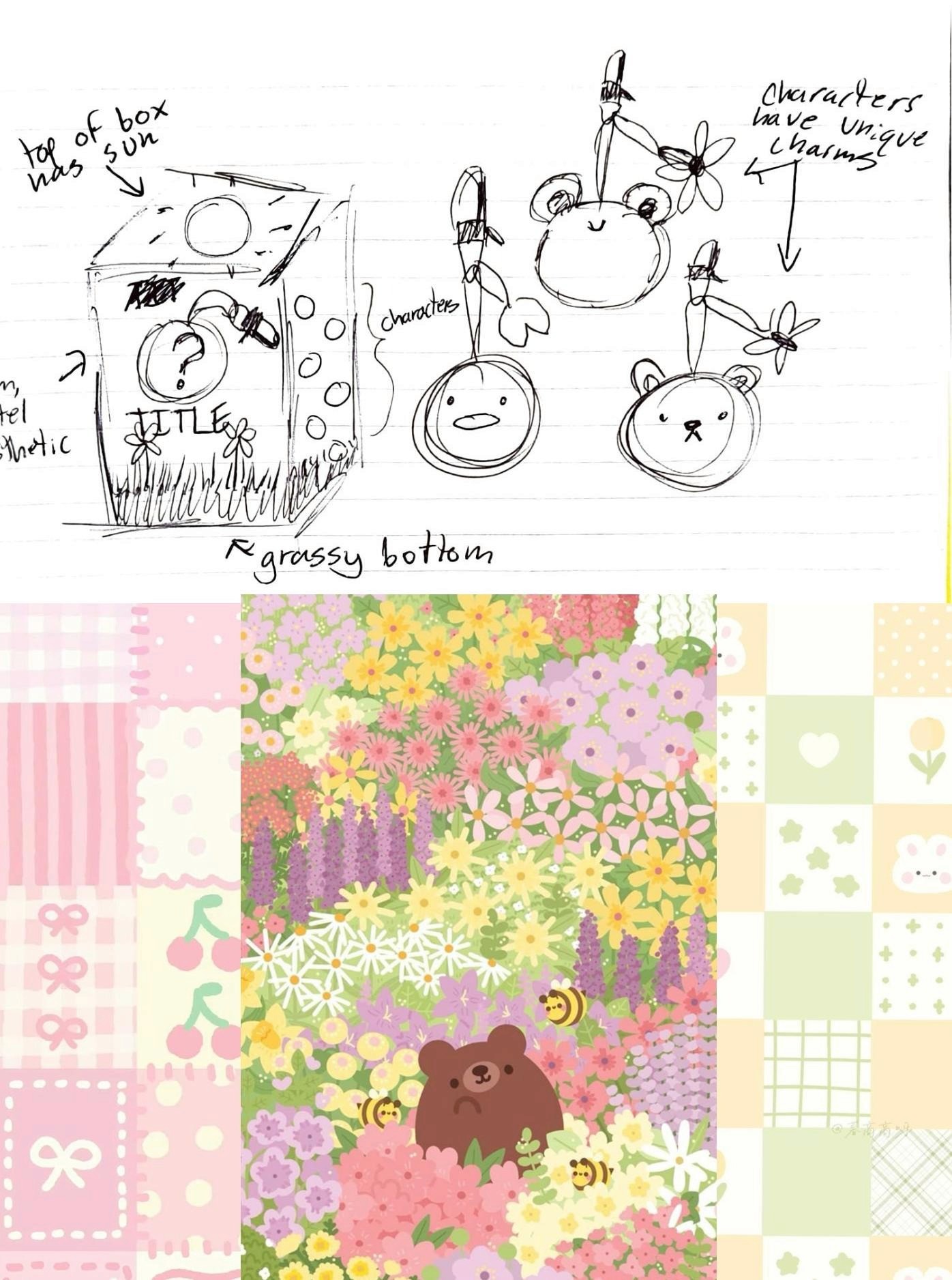 A blind box package design that focuses on making all of the animal keychains into their own identifiable critters. Clearly labeled to ensure there was no confusion about what was being sold. Following the general meadow, pastels, and cute aesthetic of the original keychains.