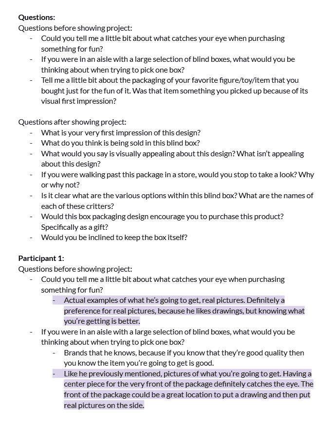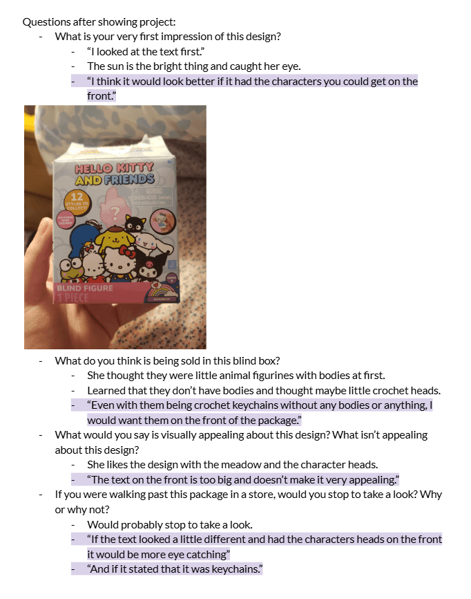 After creating the first iteration of the packaging design, I wrote some interview questions. I interviewed two different people, one being college age and the other being a teenager, in order to get some insight about what worked well and what would need to be changed.