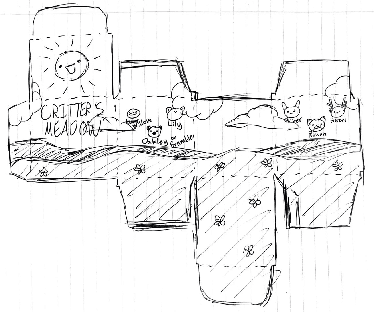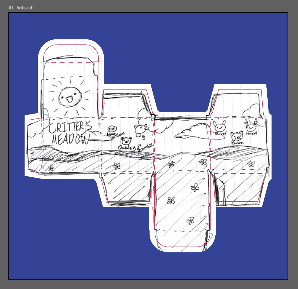 Very roughly referencing the dieline template I had just put into Illustrator, I sketched the package design onto paper. A few of the ideas that were in the very rough initial concept sketch were included in their sketch for the dieline design. During this sketching process I also started giving each of the animals names in contribute to the character aspect seen on a lot of blind boxes. This sketch was then placed into the dieline template in Illustrator.