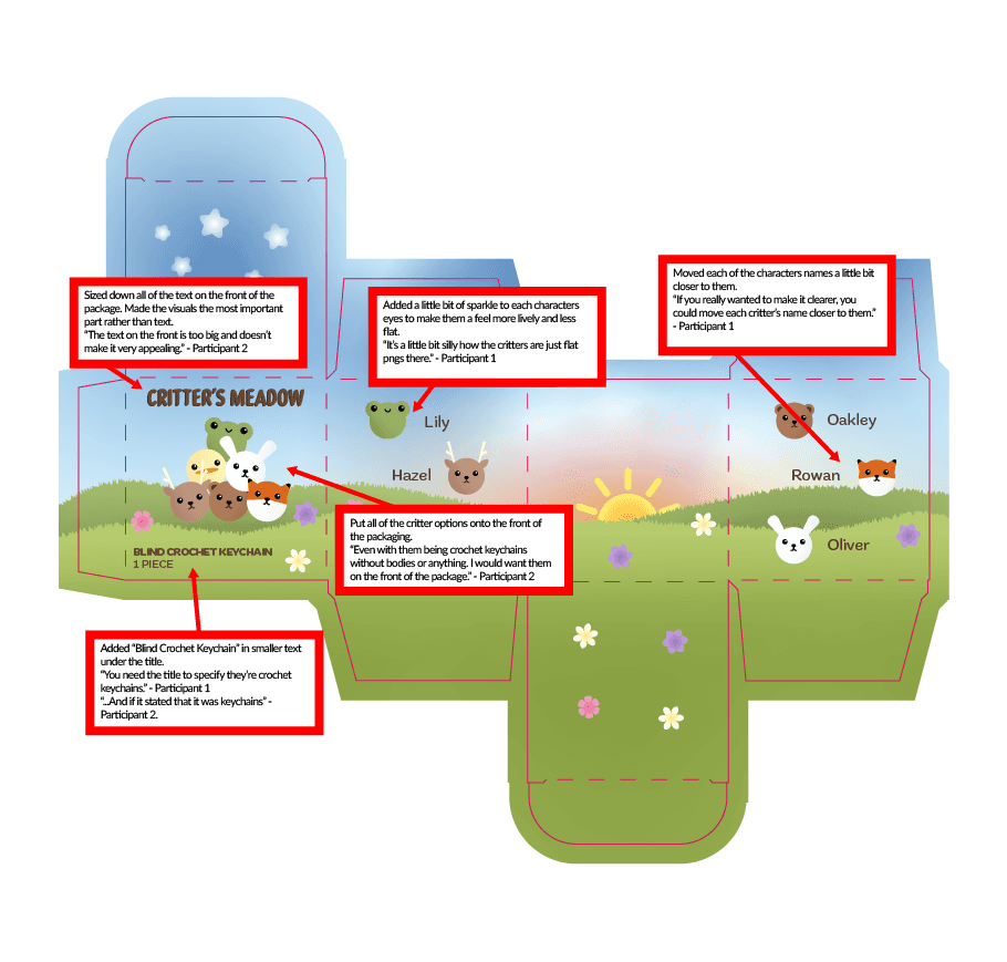 I then made changes to the packaging design referencing the notes I had taken during interviews. All changes included what was changed about them and the specific quote from the participant that encouraged that change to be made.